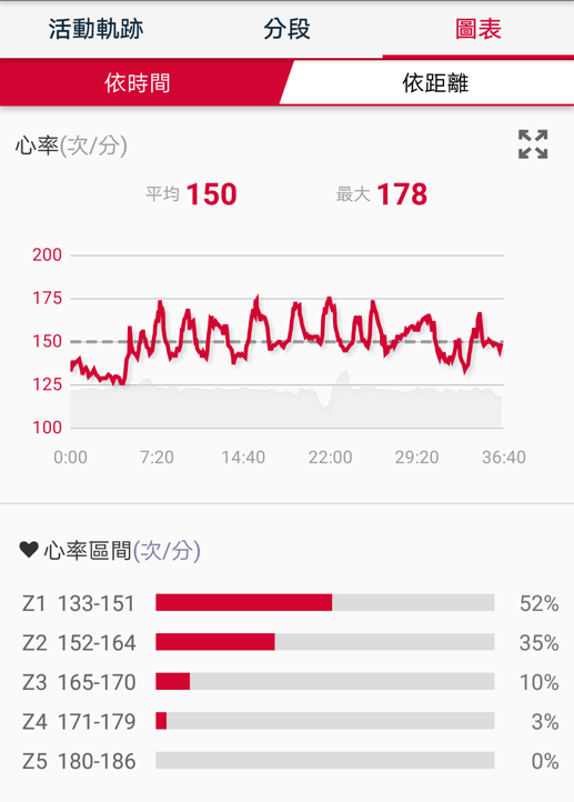 心率區間5是最大心率的90%~100%,體感就是跑到快要斷氣的那種,以這一季我的狀態,心率達到180以上,才可以進入心率區間5的殿堂。