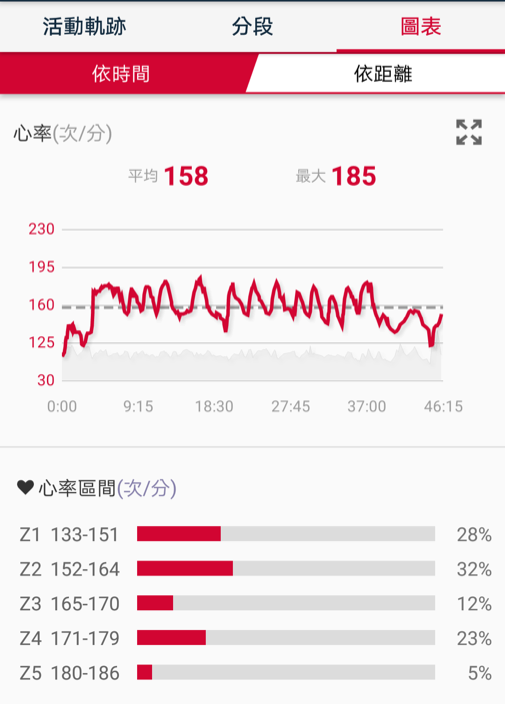 回頭再看成績,有5%進了心率區間5耶~~~(旋轉撒花),雖然成績應該也是不及格但至少我跑進去了94爽~~~區間5歡迎你回來 唷(感動)~~~~~~